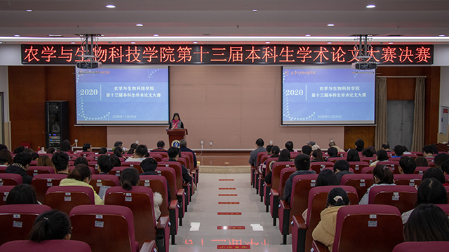 为增强学院学术底蕴,培养学生创新精神,提高科研实践能力,促进学院学术科技活动蓬勃发展,11月28日下午14:30,农学与生物科技学院第十三届本科生学术论文大赛决赛于隆平楼204顺利举行。学院党委书记阳义健出席大赛,学院党委副书记郑莉佳主持大赛及颁奖典礼,十一位专家教授组成强大阵容的评审团和各班学生代表组成的大众评审对10项参赛作品进行评审,各参赛作品指导老师、各年级辅导员、2018、2019级隆平拓展班的全体同学以及各班学生代表到场观摩比赛。