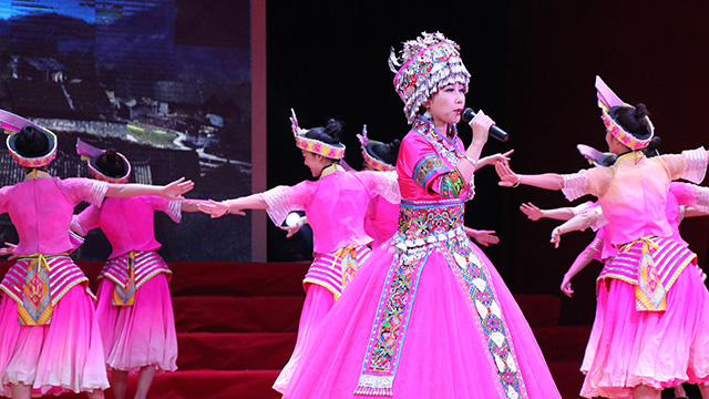 歌舞演绎了朴素的土家风情,交织着热情与奔放,展现生活的色彩,给我们带来了一场视听盛宴。作为重庆市唯一的一个省级专业民族文艺团体,歌舞团曾在全国各项专业文艺大赛中获得大奖,也曾多次代表国家和文化部出访巴西、法国、保加利亚等国家演出。被文化部授予“全国首批专业文艺院团改制先进单位”、“第六届全国服务农民服务基层文化建设先进集体”,被国务院授予“全国民族团结进步先进集体”。为表示感谢,晚会期间,园艺园林学院唐荣发书记代替梁国鲁院长向重庆市民族歌舞团赠送了梁院长的书法作品“艺不染尘,纵揽云飞”。