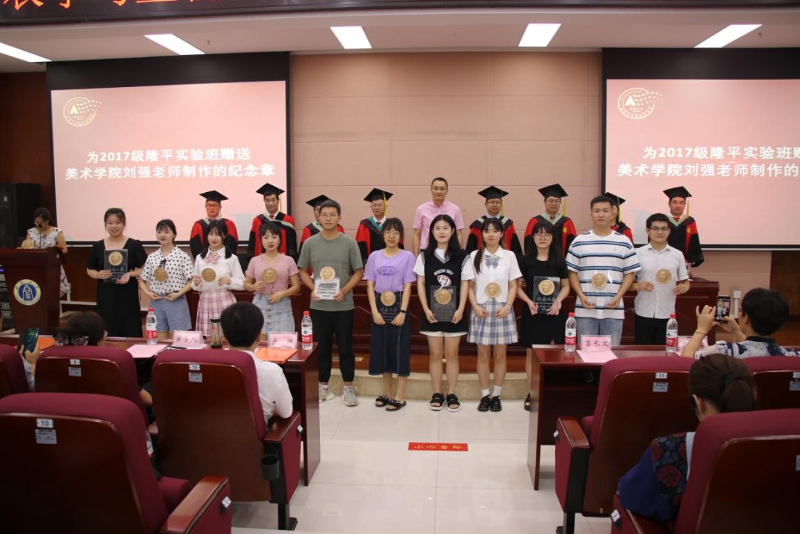 美术学院教师刘强向2017级隆平实验班毕业生赠送“袁隆平院士纪念章”,隆平实验班代表上台领取纪念章。