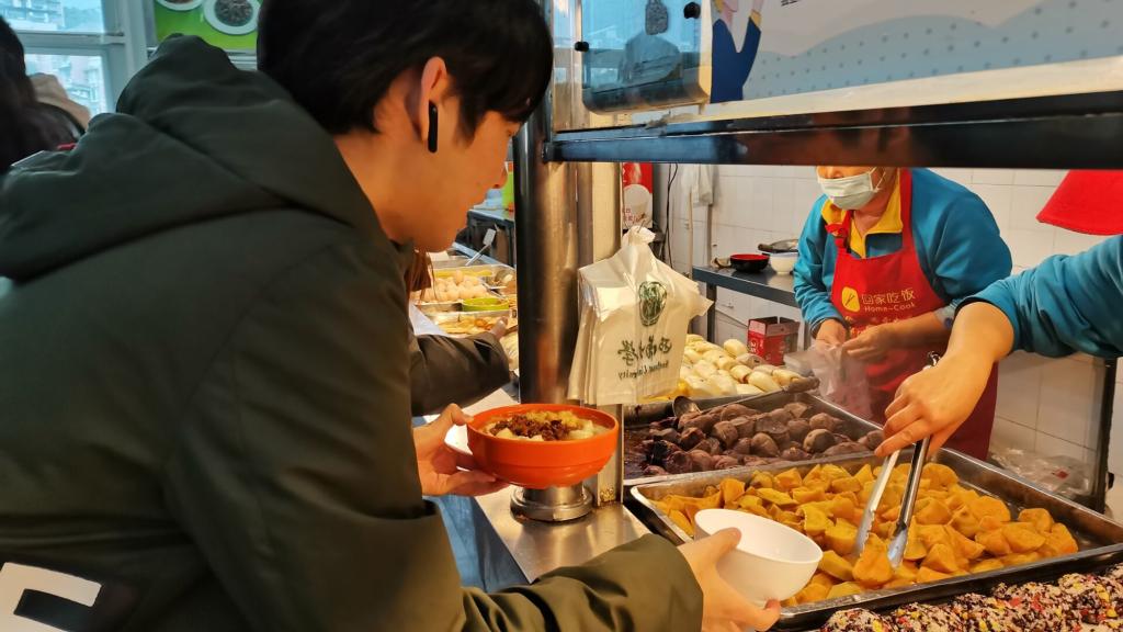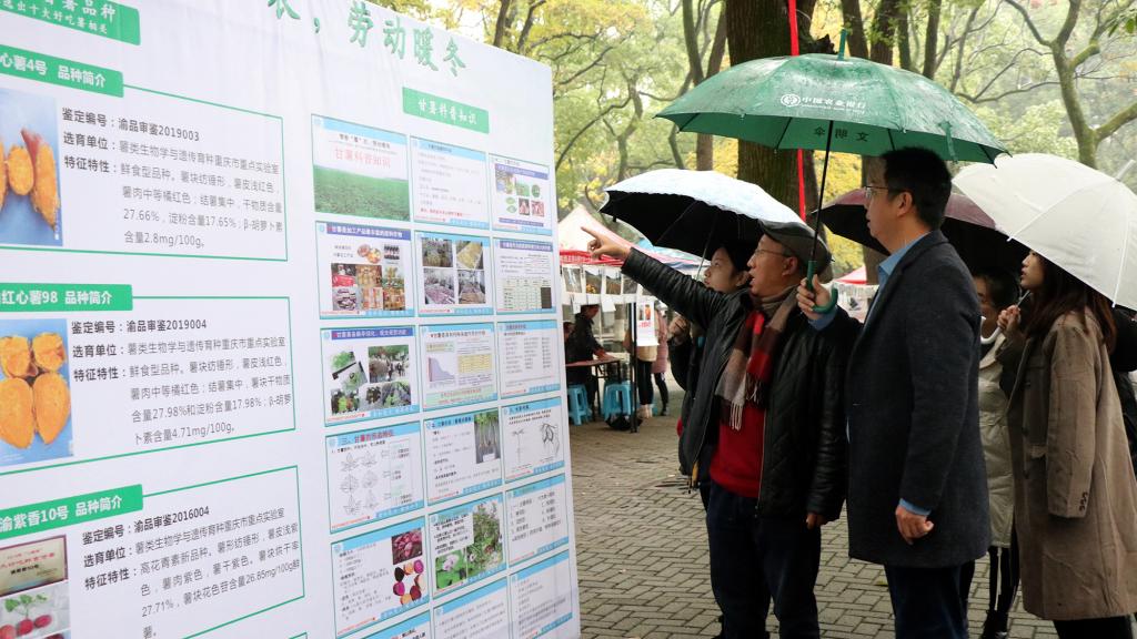 11月21日,学院师生在校内南区樟树林进行甘薯科普知识宣传及专业学生生产实践劳动场景照片展,参与答题的同学可以免费领取烤好的红薯。即便下着大雨,香喷喷的红薯依旧吸引了不少同学前来围观。11月22日,教务处、学院与后勤集团膳食中心衔接,在全校学校7个学生食堂和2个教工食堂开设专门的免费品尝窗口,分别于早餐、午餐和晚餐时段,将同学们收获的三个品种约2000斤甘薯蒸熟免费供全校师生品尝。早上7点多,成人文学