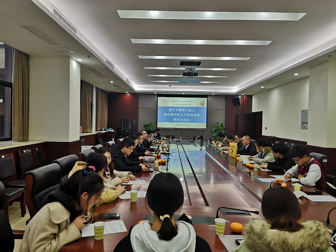 为贯彻落实中央农村工作会议精神和立德树人根本任务,发挥学科特色和优势,提升新农科人才培养质量,学院于12月27日下午15:00在隆平楼108会议室召开“提升立德树人能力,提高新农科人才培养质量”座谈会。学院党委书记阳义健、院长吕典秋、副院长张建奎、农学系主任桑贤春、陈志友博士后和陈新龙博士出席了会议。参加会议的还有学院教师代表、硕博士研究生代表、本科生代表。会议由阳义健书记主持。