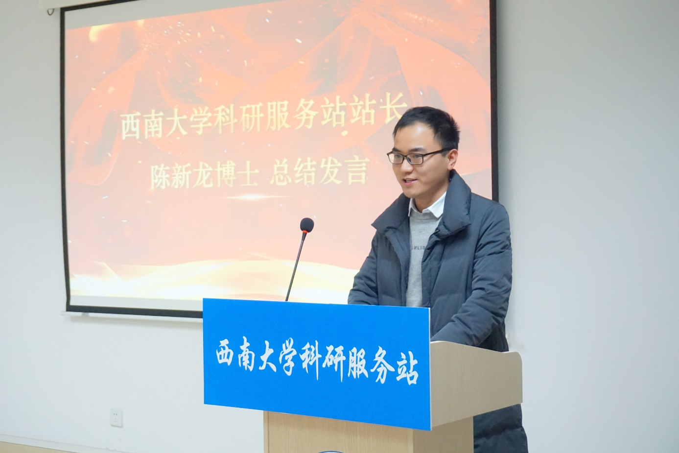 科研服务站站长陈新龙博士作总结发言。陈站长首先代表服务站对学校、学院和各界的支持表示衷心感谢,对获奖同学表示热烈祝贺。随后,陈站长对服务站走过的点点滴滴进行了概括性总结。陈站长感慨道,自组建以来,服务站经历过各种挫折,遇到过不计其数的困难,也有接二连三的问题需要解决,但服务站志愿者们从未退缩,无论是线下科研帮扶,还是线上科研帮扶,服务站始终秉承科技报国初心,担当科研帮扶使命,竭尽全力帮助每一位向服务站求助的科研学子解决科研困惑,在2020-2021学年度累计向学校近2000名同学提供科研志愿帮扶,创造了“科研困惑有求必应”、“援助成功率高达96%”的骄人成绩,这些成绩离不开服务站志愿者们的齐心协力,更离不开一直默默支持服务站工作的老师和同学们。最后,陈站长呼吁更多同学加入到服务站的建设中来,为打造立足学术、开放共享的学生科研互助平台贡献自己的一份力量。