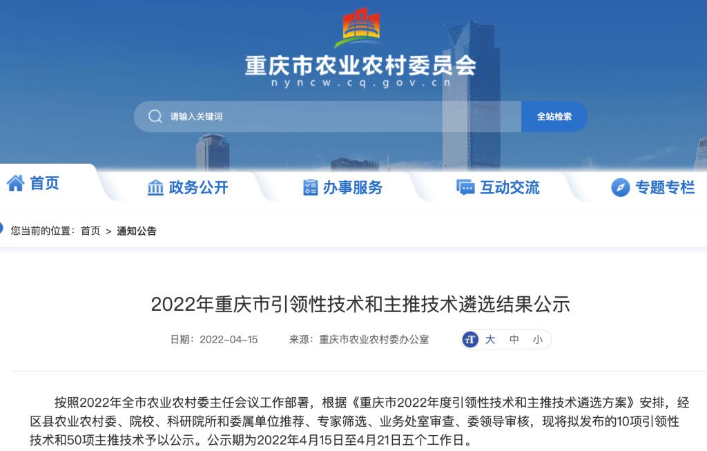在配套技术方面,4月15日,重庆市农业农村委公布了2022年重庆市引领性技术和主推技术遴选结果,成人文学