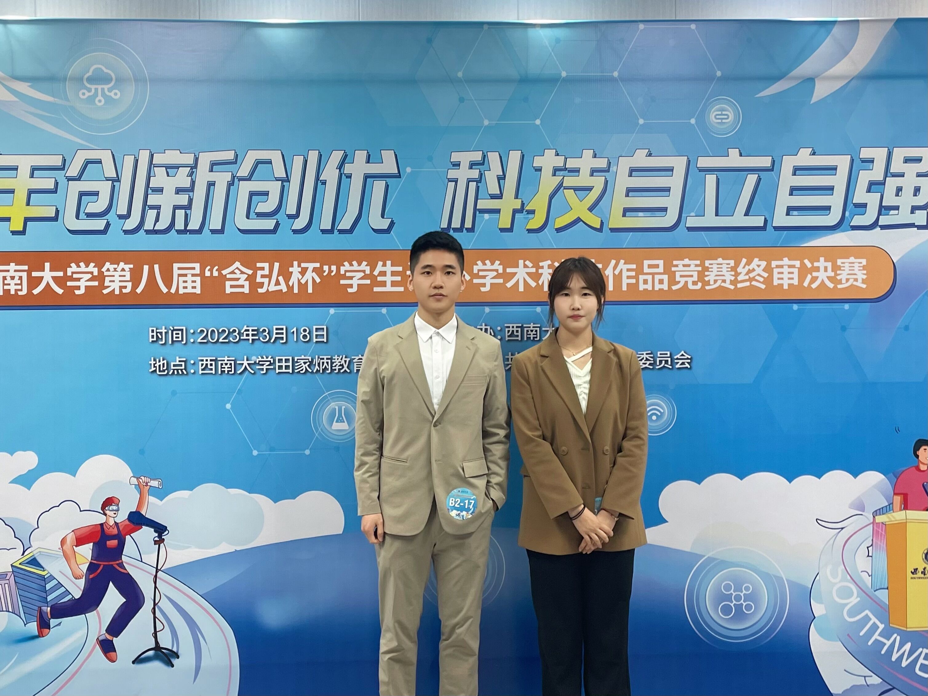 近日,西南大学第八届 “含弘杯”学生课外学术科技作品竞赛决赛落下帷幕。大赛以“青年创新创优 科技自立自强”为主题,经各学院初审遴选、资格审查,以及学校专家初审,共评选出94件作品进入终审决赛。我院有9项作品进入决赛,其中5篇自然科学类学术论文、3篇哲学社会科学类社会调查报告和学术论文和1项科技发明制作,由陈楚怡、赵梓钧、王硕等九位同学分别代表自己团队参与“含弘杯”学生课外学术科技作品竞赛决赛答辩,最终斩获一等奖2项、二等奖3项、三等奖4项,学院也以团体总分第二名的好成绩荣获大赛“优胜杯”。