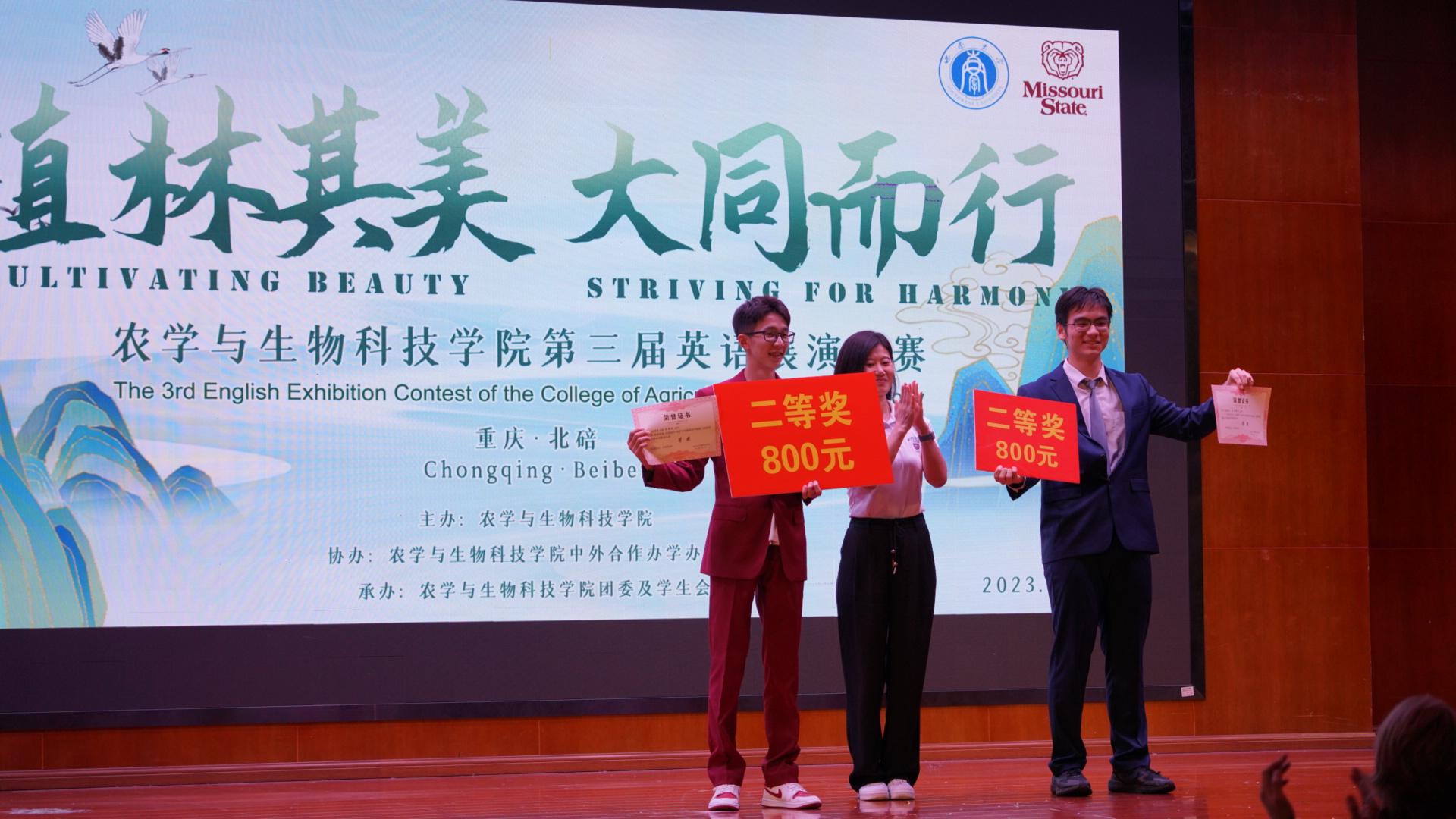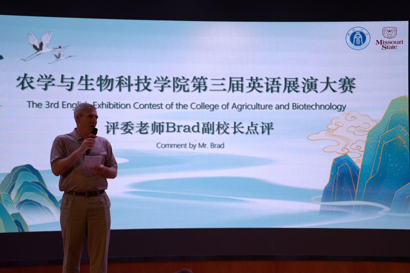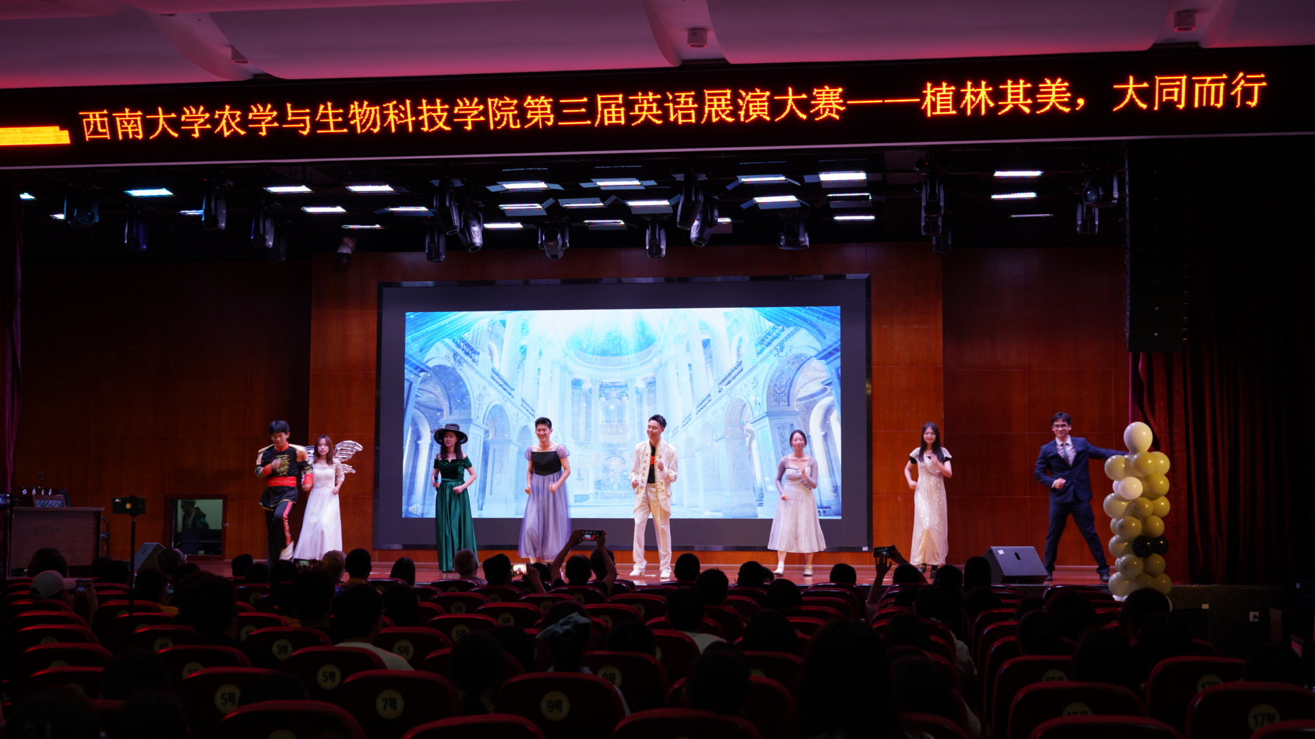为丰富学生课余生活,推进校园文化建设,激发学生学习英语热情与创作灵感,提高学生英语水平,拓宽学生国际视野,农学与生物科技学院开展了第三届英语展演大赛,大赛以“植林其美,大同而行”为主题,共设置了个人英语演讲、班级英语舞台剧展演两个赛道,从4月14日起,经过初试、复赛,最终有四个班级、六名同学入围决赛。6月2日晚7点,学院在南区学生活动中心107举行决赛,MSU副校长Brad、中国项目办公室主任刘丹丹、驻西南大学教师Kevin及Joshua、国际合作交流处副处长胡琳,学院院长吕典秋教授应邀出席并担任评委。
