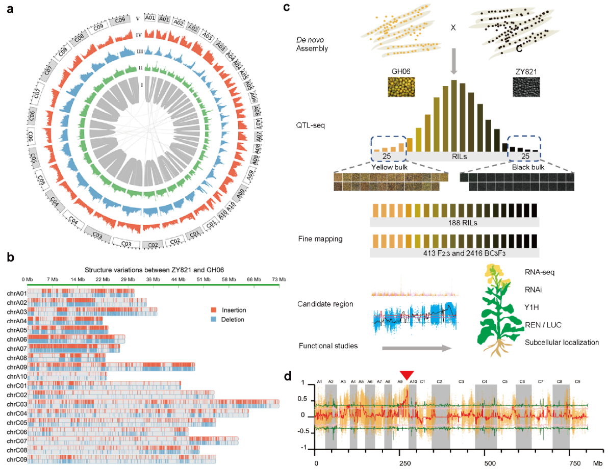 油菜分子生物学研究团队李加纳教授/曲存民教授在Nature Communications发表了题为Comparative genomic analyses reveal the genetic basis of the yellow-seed trait in Brassica napus的研究论文,该研究通过甘蓝型油菜黄籽GH06和黑籽中油821高质量基因组的组装,围绕控制种皮色泽主效QTL区间,成功克隆了一个控制油菜种皮色泽重要基因,并解析了其参与调控种皮色泽形成和类黄酮代谢的分子机制,为油菜品质性状改良提供了新的分子策略。