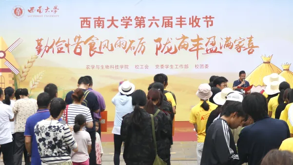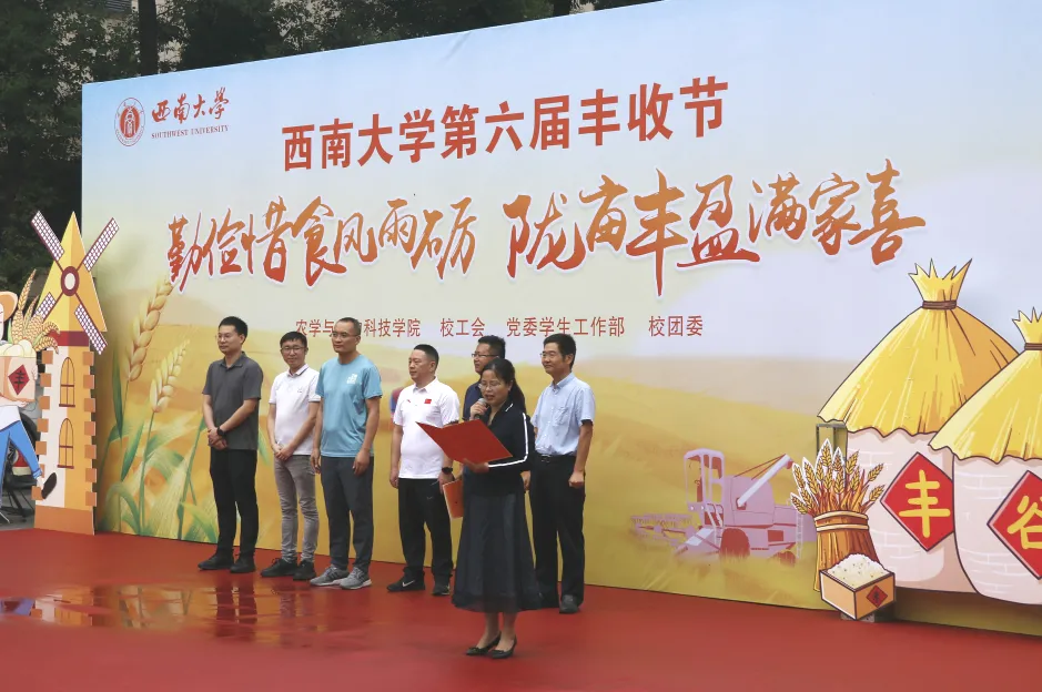 勤俭养德力,风雨耕心田。陇亩丰盈喜,万家和谐安。为庆祝第六届“中国农民丰收节”,2023年9月23日,农学与生物科技学院以“勤俭惜食风雨砺,陇亩丰盈万家喜”为主题,举办了西南大学第六届丰收节系列活动。西南大学党委学生工作部副部长罗军、共青团西南大学委员会副书记李立、西南大学工会委员会副主席任四海、农学与生物科技学院党委书记阳义健、院长吕典秋、副书记郑莉佳、副院长张建奎,以及学院师生出席开幕式,一起分享丰收的喜悦,共谋乡村全面振兴新篇章。