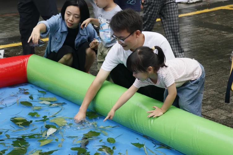 在“浑水摸鱼”比赛现场,参赛的队伍汇聚在室内人造池塘旁。比赛开始,计时器滴答作响,队员们迅速伸手进水,紧抓泥鳅和鲤鱼,然后迅速递到场外的水桶内,泥鳅积2分,鲤鱼加1分。紧张的两分钟内,积分不断上涨,观众和队员们都紧盯着比分牌,争夺胜利。观众们无不感到兴奋,侥幸脱手的鲤鱼飞跃至空中,惊起了一片尖叫声。