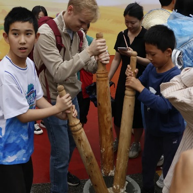 首先举行了丰收节开幕仪式,农学与生物科技学院吕典秋院长致辞,号召大家以节为媒,释放情感,传承文化,寻找归属,助力乡村振兴!接着,全体师生们一起体验了传统打糍粑活动,蒸好的糯米迅速放入石槽,被硕大的木杵一下一下地舂至绵软柔韧,新鲜软润的面团就成形了。“原来糍粑是这样制作出来的,以前从未亲手做过。”参加活动的同学们惊喜地说道。