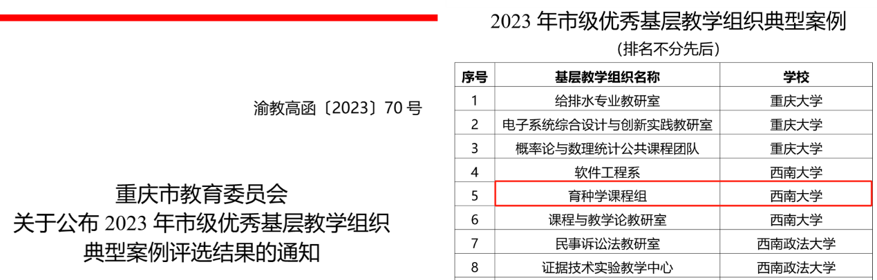今年以来,我院育种学课程组在课程组建设和作物育种学课程建设方面相继取得了丰硕成果。11月9日,重庆市教育委员会公布了2023年市级优秀基层教学组织典型案例评选结果(渝教高函〔2023〕70号),我院育种学课程组喜获“2023年市级优秀教学组织典型案例”,成为西南大学入选2023年市级优秀基层教学组织典型案例三个案例之一。