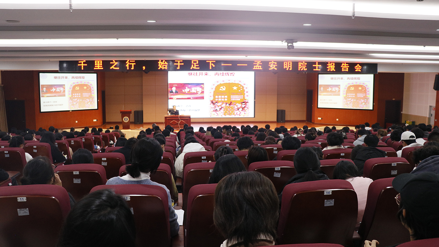 报告会伊始,孟安明院士先是带领同学们回顾了中国的发展史,讲述了老一辈革命先烈是如何在黑暗中摸索道路,最终成立新中国的经历。孟安明院士表示,当今世界仍充斥着硝烟,我们只是有幸生活在和平的国度。在新的中国,新的征程,中国人民该如何继往开来再续辉煌?孟院士的讲话引发同学们的深思。