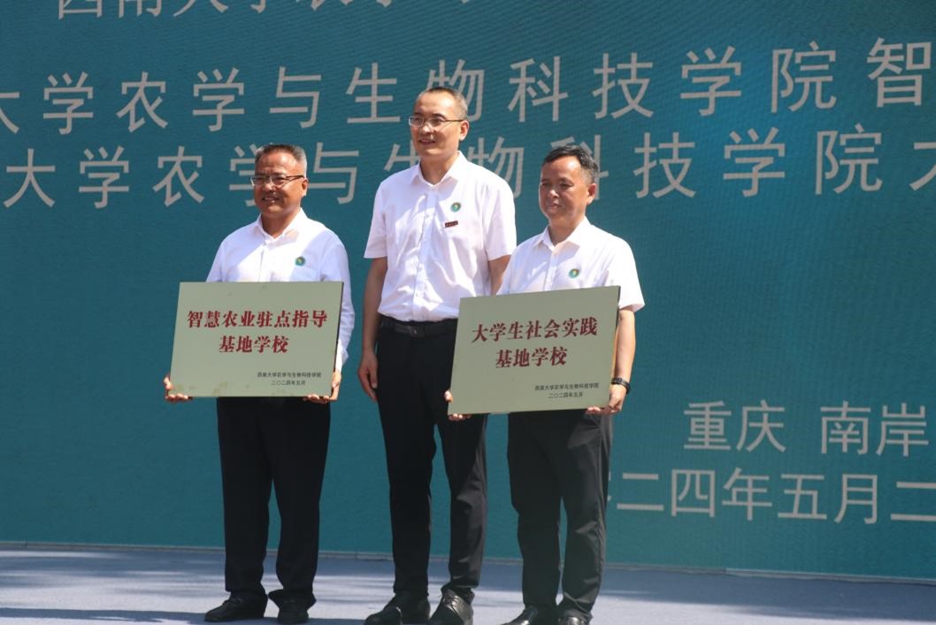 在与会人员共同见证下,西南大学农学与生物科技学院院长吕典秋与重庆市南岸区龙门浩隆平小学校校长董宏燕代表双方单位签订合作协议。西南大学农学与生物科技学院党委书记阳义健、院长吕典秋、副院长曲存民分别为“智慧农业驻点指导基地学校”“大学生社会实践基地学校”“薯类生物学与遗传育种科普教育基地学校”和“作物分子改良科普教育基地学校”揭牌。
