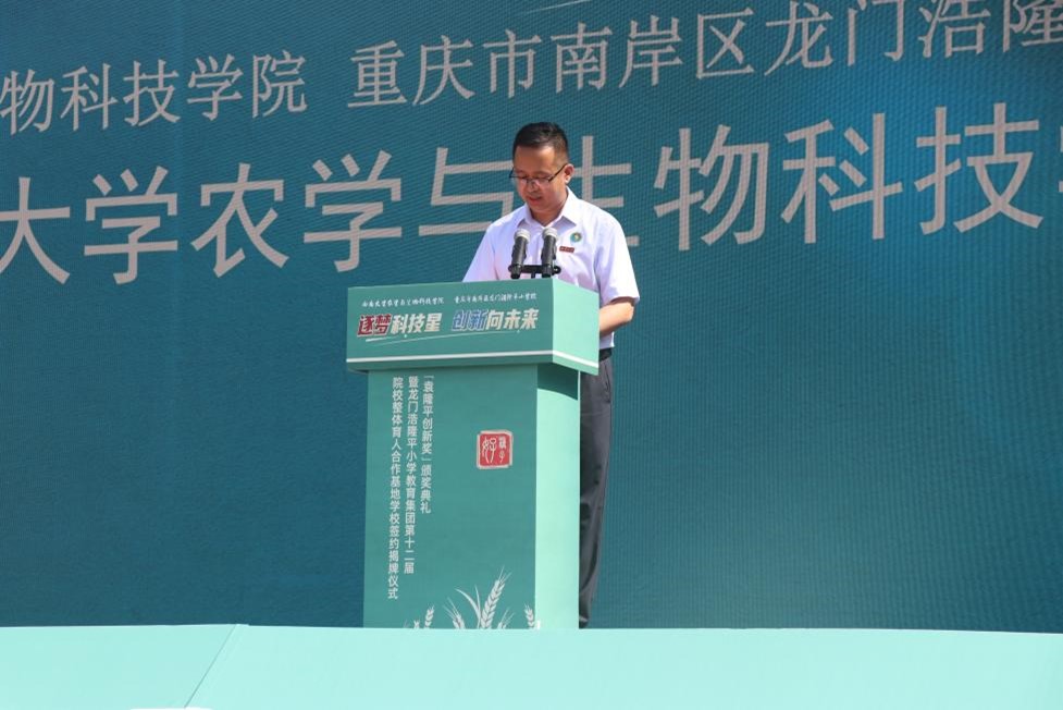 西南大学农学与生物科技学院院长吕典秋在致辞中表示,两校同为袁隆平院士的母校,因袁隆平院士而有着特殊的联谊意义。两校决定在劳动教育、社会实践、科普教育、基层党建等方面开展合作,在龙门浩隆平小学设置智慧农业驻点指导基地、大学生社会实践基地、重庆市重点实验室科普教育基地等,将更加有利于两校优势互补、资源共享、共同发展。两校携手合作,大手牵小手,将汇聚起强大合力,把袁隆平的科学家精神传承好、发扬好,让其在不同年龄阶段的学生心中生根、发芽、开花、结果。