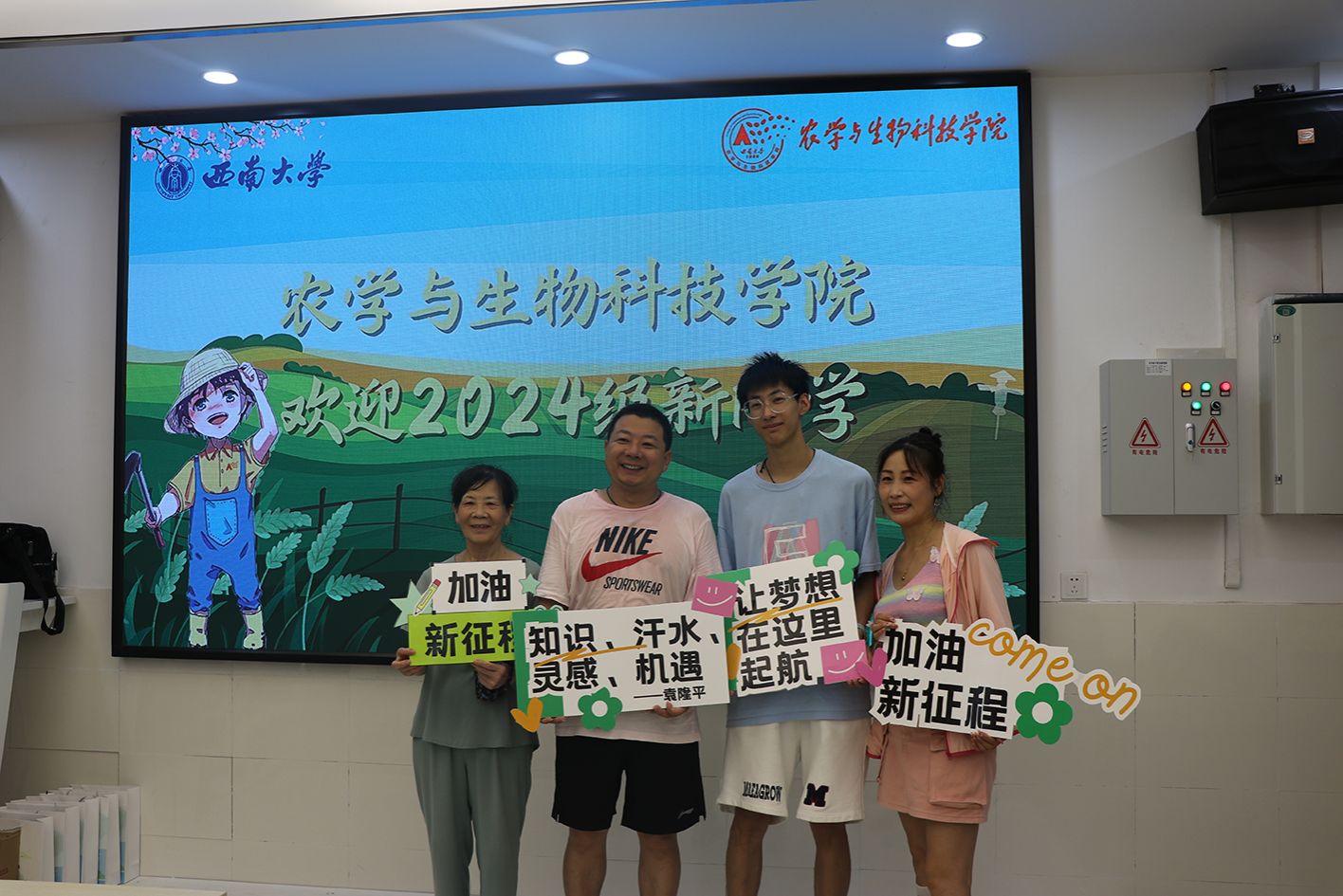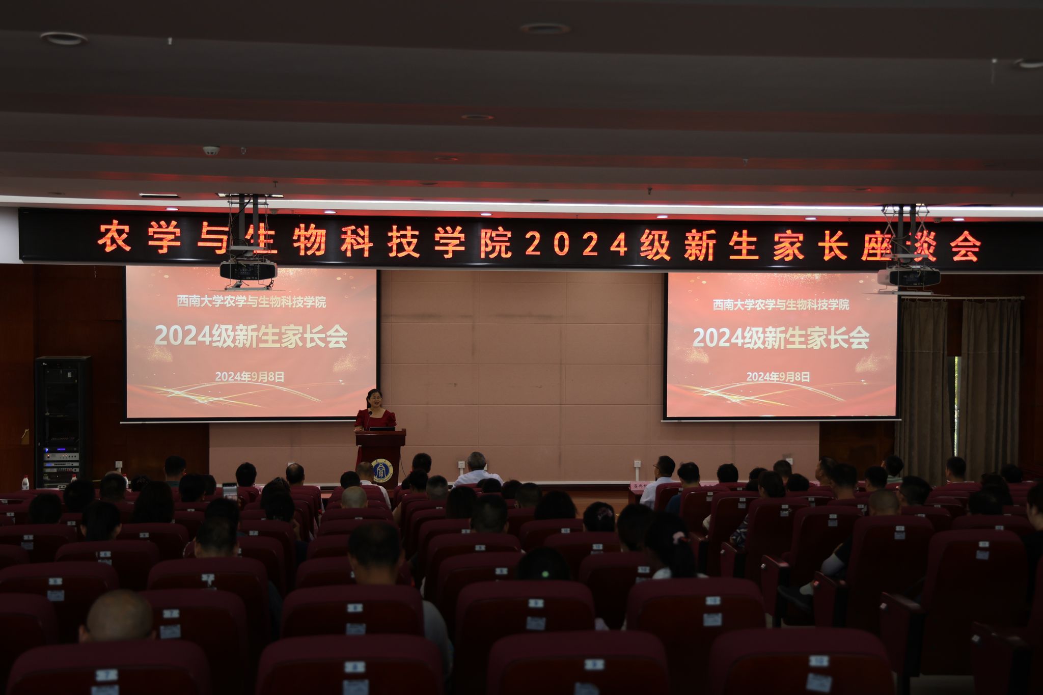9月8日15点,农学与生物科技学院2024级新生家长座谈会在隆平楼204报告厅隆重举行。学院党委书记阳义健、院长吕典秋、党委副书记郑莉佳,副院长张建奎、各系主任、教学办公室主任、2024级辅导员及各班班主任出席了见面会,会议由党委副书记郑莉佳主持。在《我有一个梦》的优美旋律中,新生家长们陆续步入会场。党委副书记郑莉佳向新生家长逐一介绍出席座谈会的领导嘉宾并代表学院向家长们的到来表示热烈的欢迎。院长吕典秋从学院的办学历程、师资队伍、学术科研、人才培养、毕业生就业情况等方面,向新生家长们做了全面而详细的介绍。辅导员王皓老师就学生住宿、学校生活、学生可能遇到的机遇与挑战、家长遇到的常见问题等方面进行了指导,希望家长可以做好学生坚强的后盾,做到倾听、理解、支持、信任。同时也针对学生学业管理、安全教育等重要事项进行了沟通与说明。会议最后,学院党委书记阳义健讲话,希望大一新生入学后,珍惜宝贵时光,积极面对生活环境、人际环境、经济环境和学习环境的变化,向学院的研究生党员标兵、创新创业大赛金奖获得者等优秀学长学姐看齐。同时,他表达了对家长信任的真切感谢,希望未来加强家校协同育人机制,共同培养“德智体美劳”全面发展的新农人。