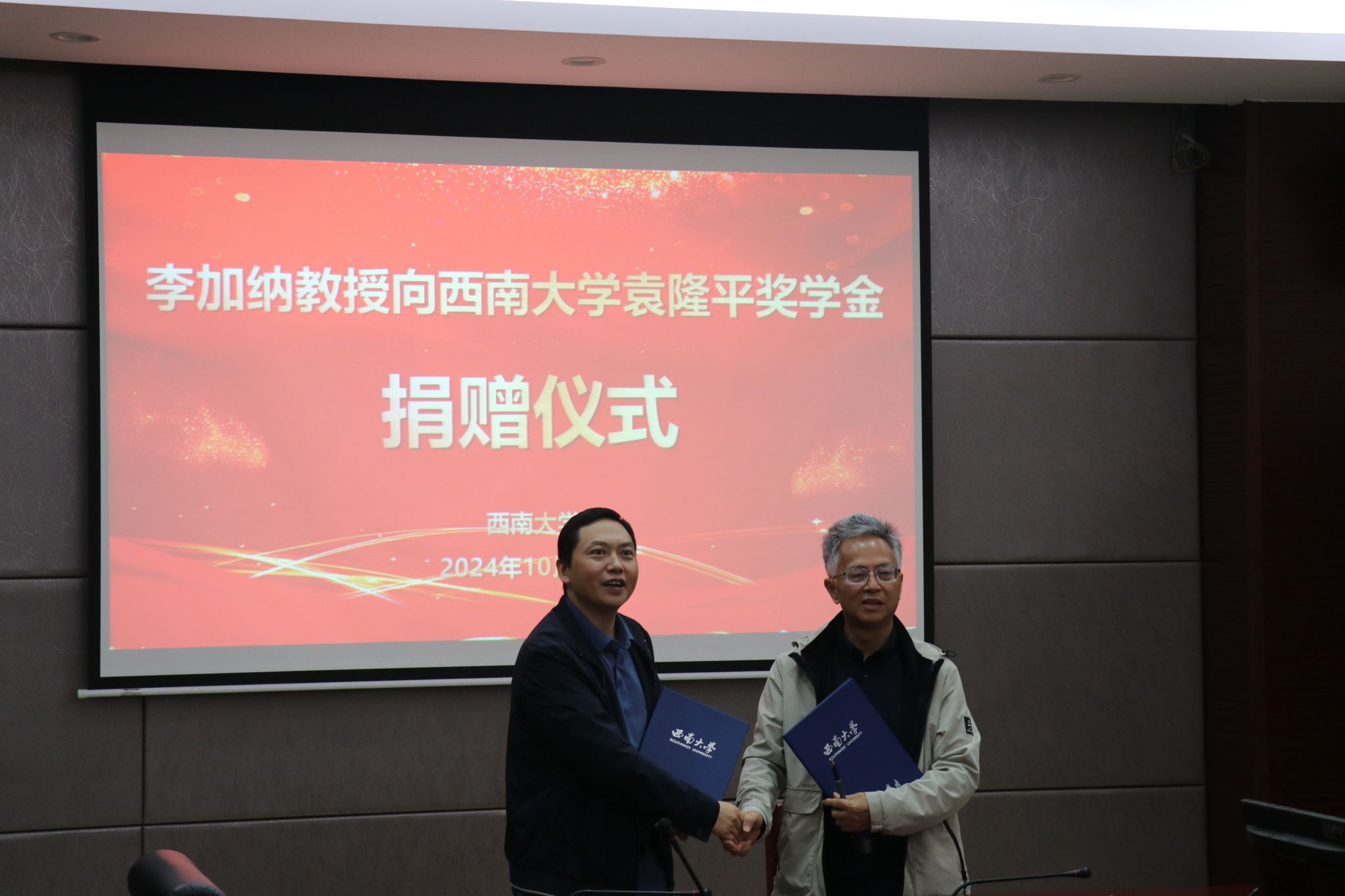 10月10日上午,李加纳教授向西南大学袁隆平奖学金捐赠仪式在隆平楼108多功能厅顺利举行。校党委常委、副校长葛信勇,对外联络办公室唐军主任、陈建英副主任, 学院李加纳教授、领导班子全体成员和师生代表等参加了捐赠仪式。仪式由学院党委书记阳义健主持。