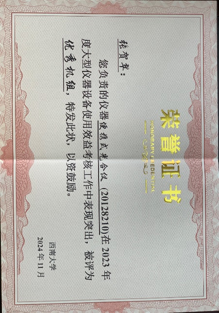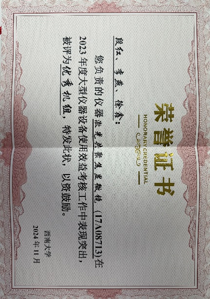 学院张贺翠、段红、李燕、徐鑫等老师负责的仪器使用获得“优秀机组”称号