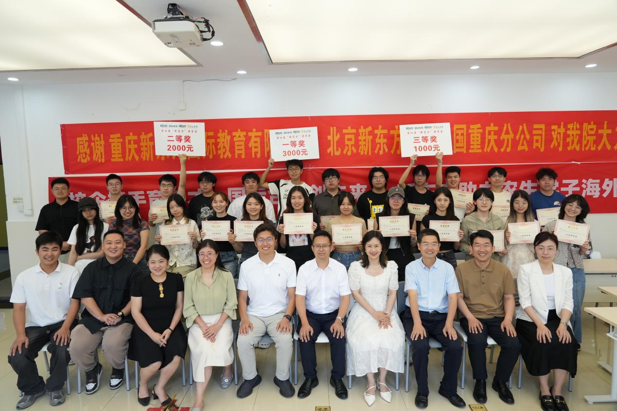 张建奎副院长宣读了本届“新东方奖学金”获奖名单,参会领导嘉宾给获奖同学进行了颁奖。本次的奖励金额共四万元,同时,学院配套出资10万元另行奖励该批转校区学生。据悉,“新东方奖学金”从2022年设立起,已资助我院学生41位,总计金额9万元。2025-2027年“新东方奖学金”将由重庆新东方国际教育有限公司每年捐赠3万元,由北京新东方前途出国重庆分公司每年捐赠1万元共同组成,该捐赠将连续3年,共计12万元注入学院“新东方奖学金”基金池。
