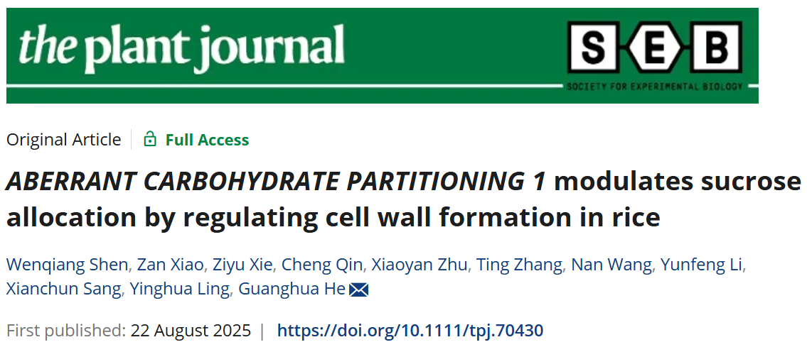 近日,西南大学农学与生物科技学院水稻团队在植物学知名期刊The Plant Journal发表了题为“ABERRANT CARBOHYDRATE PARTITIONING 1 modulates sucrose allocation by regulating cell wall formation in rice”的研究论文,揭示了ACP1介导细胞壁的形成调控光合产物运输的分子机理。