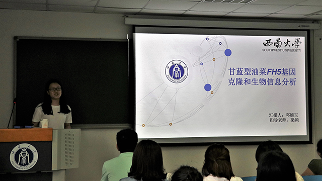 5名同学分别作了题为“甘蓝型油菜FH5基因克隆和生物信息分析”“干旱胁迫下蚕豆叶角质层蜡质的生理生态学研究”“玉米雌雄穗分化过程”“油菜MYB69转录因子抗病性调控机理研究”“甘蓝型油菜大粒基因精细定位”的进展报告。同学们分别从“实验的主要研究内容、项目完成情况、主要研究结果与结论、后期计划及目前存在的问题”等方面进行汇报。每个同学汇报结束后,老师们都逐一进行质询和点评指导,并从科研态度、科研道德、科研方法、PPT制作、讲演技巧等方面给同学们提出建议。