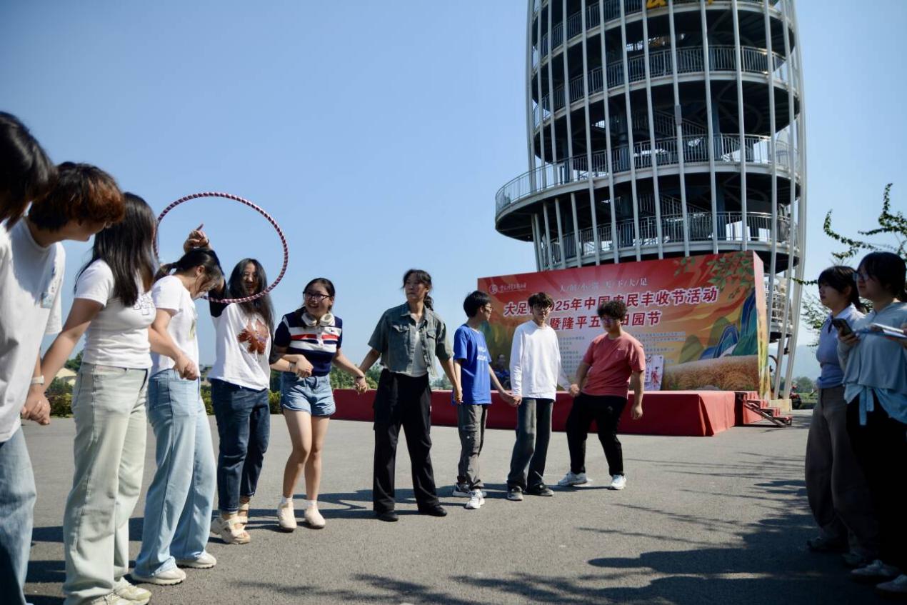 10月10日上午,同学们来到大足区袁隆平院士重庆工作站。在工作人员的带领下,大家深入田间地头与农学展厅,开启了一场植物科学的探索之旅。工作站内,绿油油的稻苗在阳光下茁壮生长。技术人员详细讲解了水稻育种的关键技术,从亲本选择、杂交配组到后代选育,每一个环节都凝聚着植物科学的智慧。五彩稻田是“从实验走向田间”的生动缩影。连片稻田并非传统单一的绿色,而是通过彩色水稻品种的巧妙搭配,在田间勾勒出袁隆平院士头像、“人间小满,天下大足”字样及稻穗图案。远观极具视觉冲击力,近看则清晰可见紫、黄、绿等不同颜色的稻穗,每一株水稻的株高与穗型均高度一致。