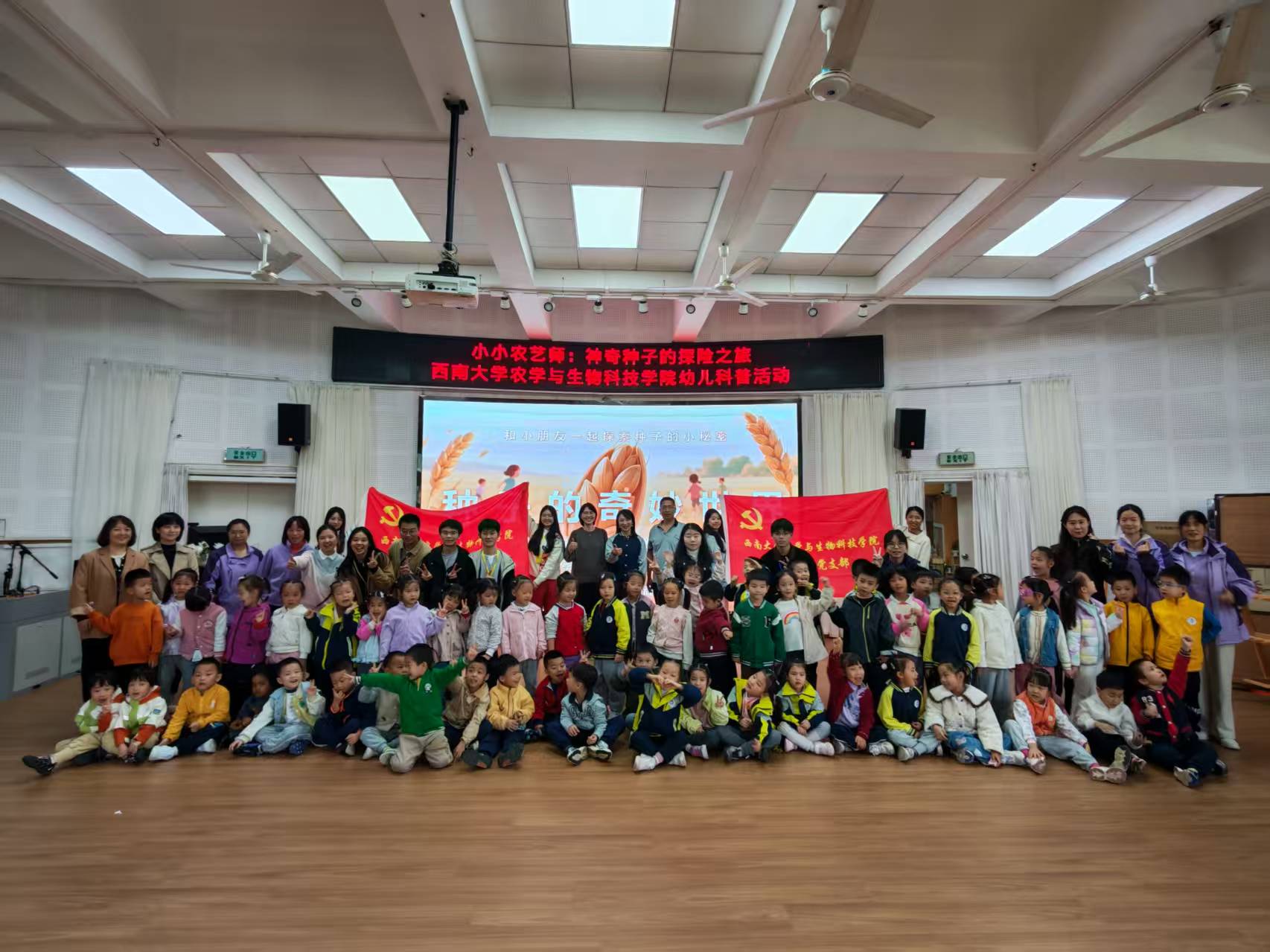 为充分发挥农学专业优势,助力幼儿科学认知启蒙,2025年11月4日上午,西南大学农学与生物科技学院教师第五党支部联合本科生农学第二党支部、本科生农学第一党支部志愿者共同走进西南大学实验幼儿园(北区),为中班、大班小朋友开展“小小农艺师:神奇的种子探险之旅”科普活动。