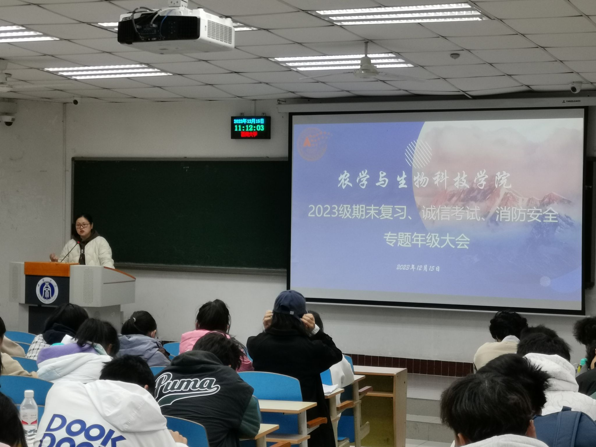 2023年12月15日,农学与生物科技学院本科2023级在32教212教室分专业召开期末年级大会。会议由各年级辅导员许莹竹老师主持,年级全体同学参加会议。