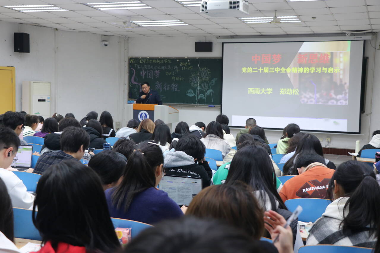 2024年11月25日16:55,西南大学农学与生物科技学院第十二期团校理论讲座第三讲在32教213教室开展,本次团校学院邀请了西南大学档案馆、校史馆、博物馆副馆长郑劲松老师为全体学员带来“中国梦,新征程”党的二十届三中全会精神学习与启示专题讲座。