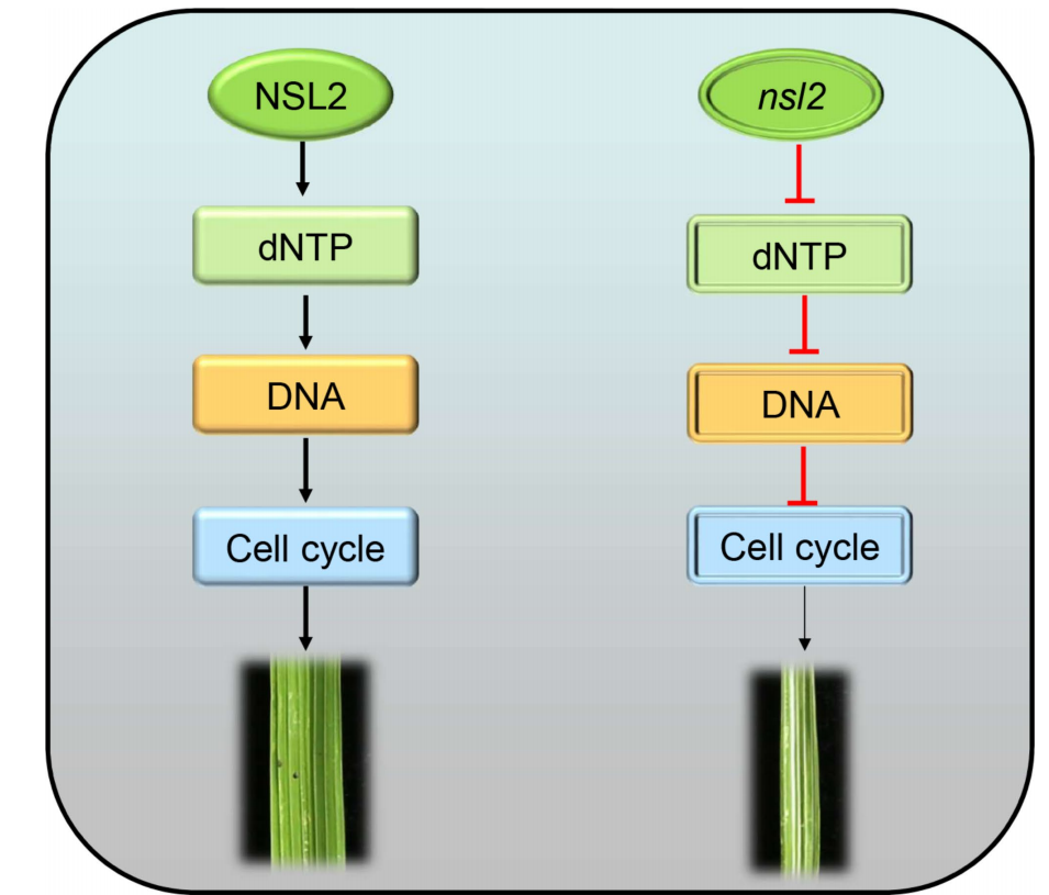 叶片形态是水稻株型的重要组成部分,对光合作用、蒸腾作用及产量有着重要影响。西南大学水稻研究所从EMS诱变体库中分离鉴定到一个水稻隐性窄条纹叶突变体nsl2 (narrow and stripe leaf 2),并据此图位克隆了目的基因NSL2,编码核糖核苷酸酶小亚基RNRS1。前人研究表明RNRS1参与调控水稻叶色及花器官的发育,但在叶型发育中的功能还未知。我们进一步研究发现,NSL2/RNRS1通过影响dNTP的合成,进而阻碍DNA的合成,导致细胞分裂速率降低,从而调控叶片宽度,这为进一步阐释RNRS1功能奠定了基础。该研究“Narrow and Stripe Leaf 2 Regulates Leaf Width by Modulating Cell Cycle Progression in Rice”近期发表在农学一区杂志《Rice》上,2022IF=5.638。博士后沈文强老师为第一作者,2018级隆平班本科生(农学专业)孙佳婕为共同第一作者,桑贤春老师为通讯作者。该论文受到了重庆市博士后科学基金(cstc2021jcyj-bshX0076)、国家自然科学基金(32171964)和重庆市自然科学基金创新群体(cstc2021jcyj-cxttX0004)项目的资助。